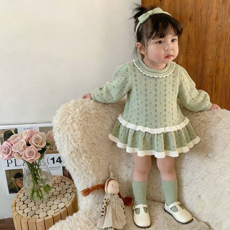 韩版甜美小清新女童针织连衣裙宝宝周岁镂空修身长袖薄款春夏裙子