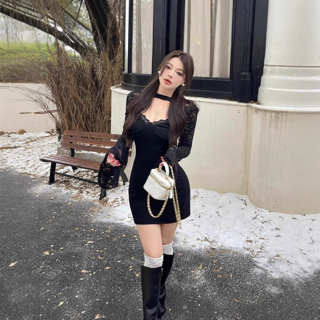 韩版小众时尚气质针织连衣裙挂脖镂空蕾丝修身收腰显瘦包臀裙子女