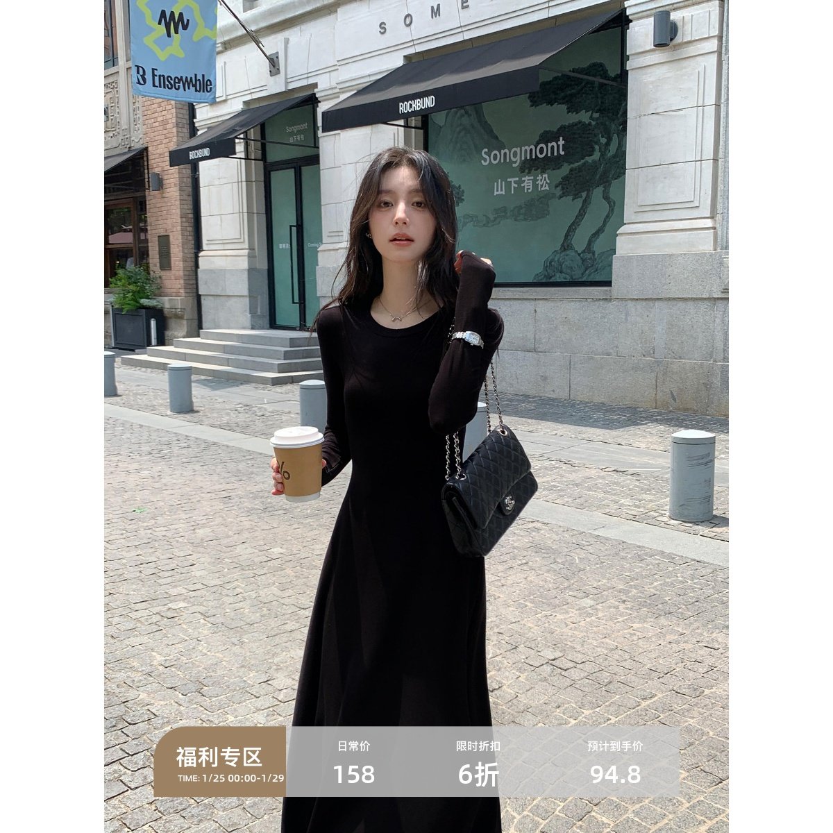 【限时福利款】纪金其秋冬黑色V领裙子女韩版修身开叉针织连衣裙