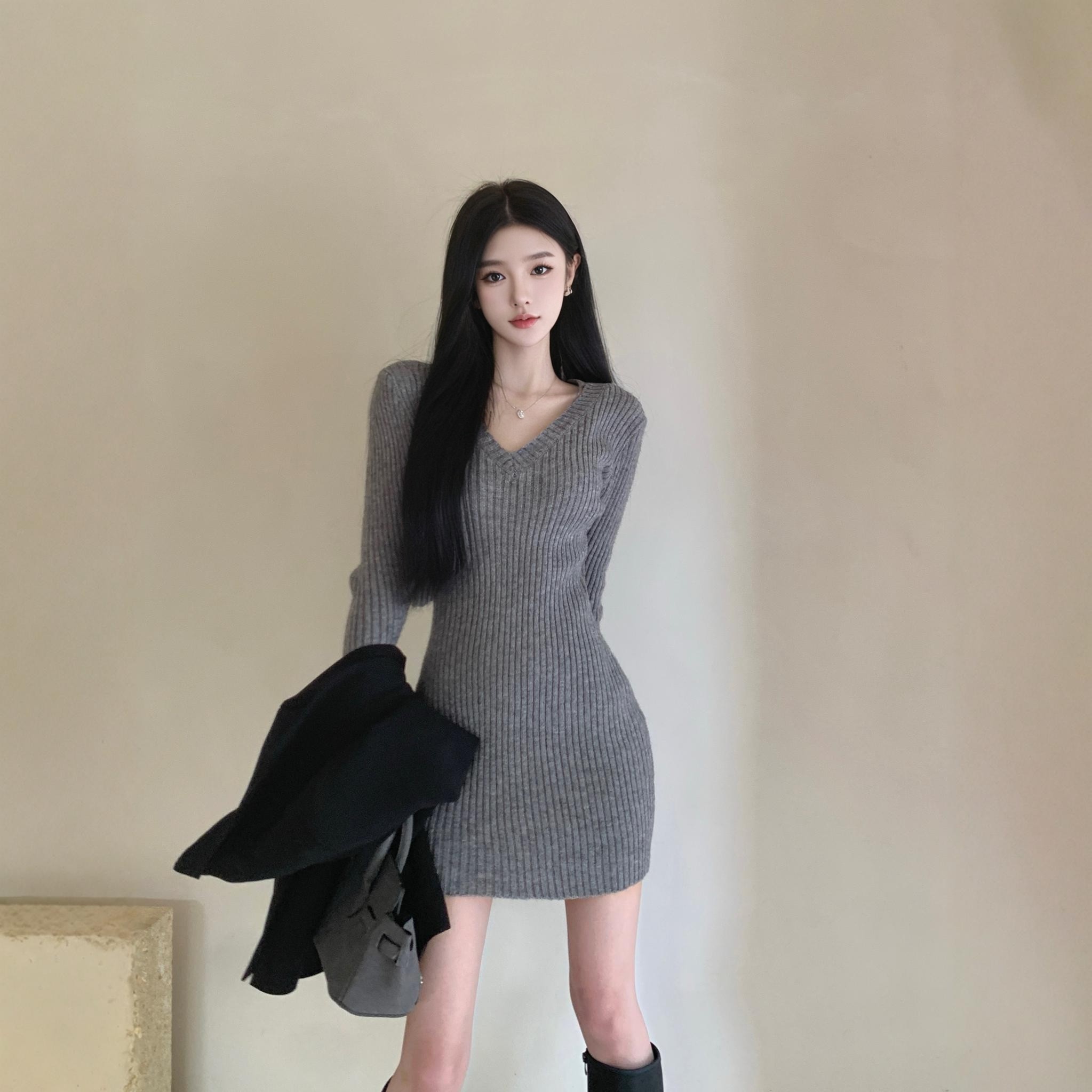 韩版chic内搭针织连衣裙秋冬新款气质V领修身收腰打底毛衣包臀裙