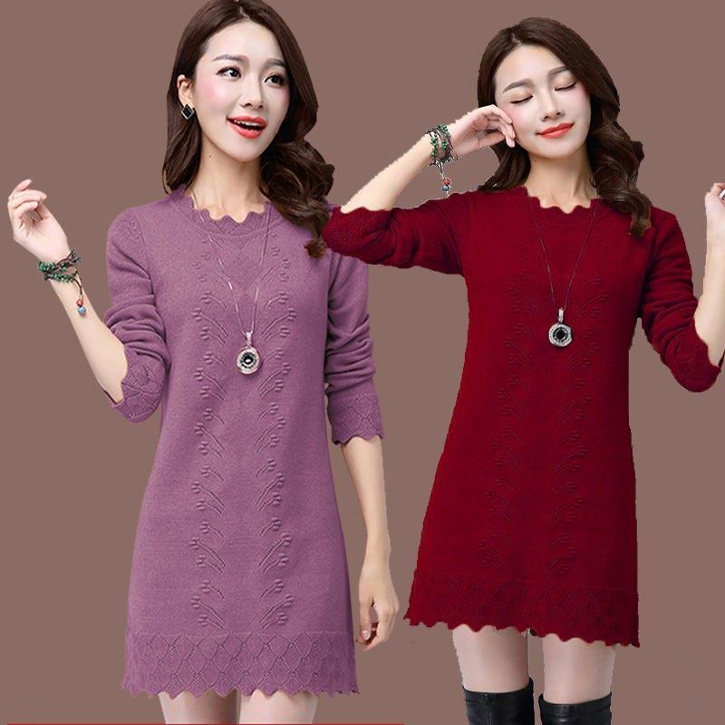 冬季新款大码毛衣女提花套头毛衣修身显瘦中长款针织衫韩版连衣裙