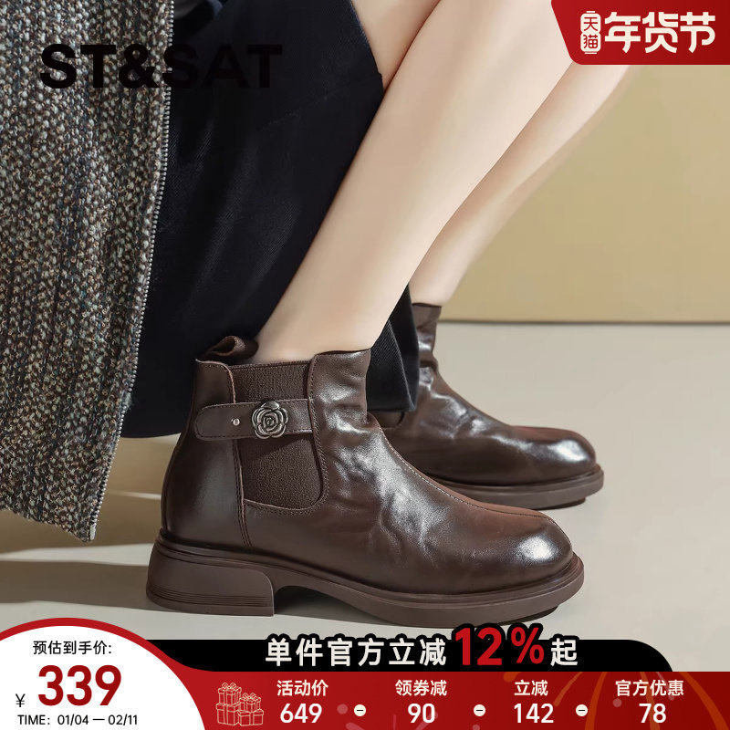 星期六英伦风厚底马丁靴女靴2025新款复古山茶花黑色短靴棕色靴子