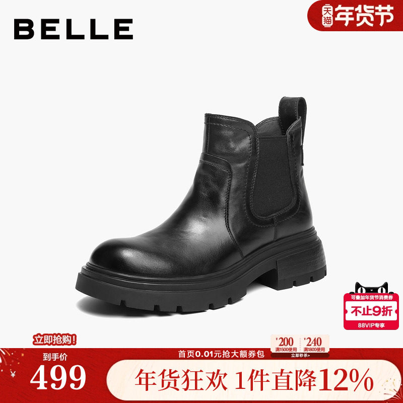 百丽复古抓皱英伦风切尔西靴子女新款真皮黑色厚底短靴B2941DD5