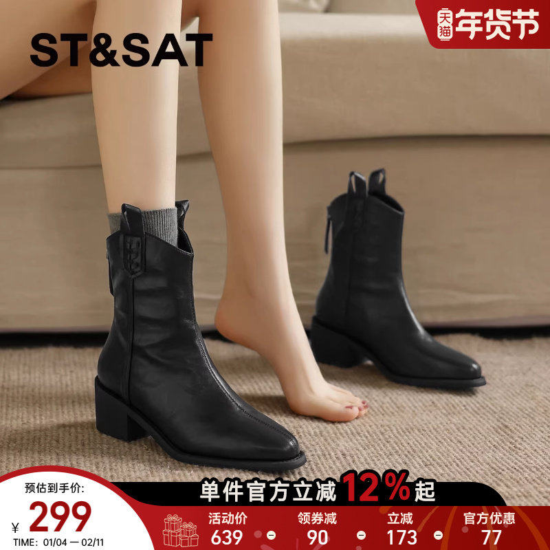 星期六英伦风短靴女2025新款秋冬黑色尖头骑士靴复古粗跟堆堆靴子