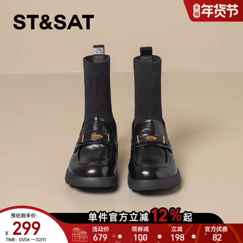 星期六英伦复古厚底乐福鞋短靴女靴2025新款秋季黑色小皮鞋袜靴子