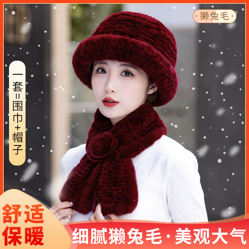 新款獭兔毛帽子围巾两件套女士冬季时尚百搭保暖护耳中年妈妈套装