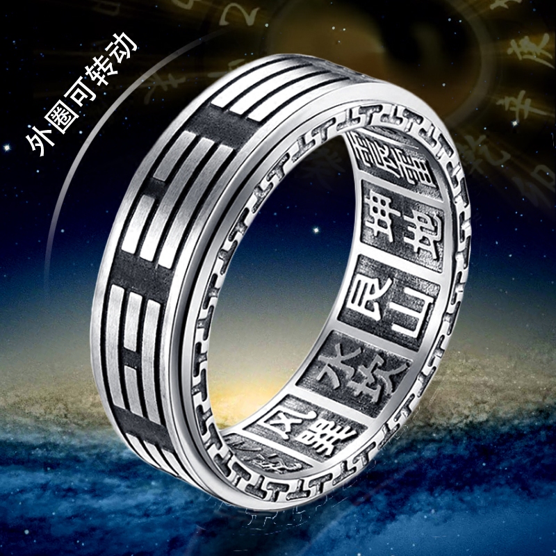 S999六字真言纯银戒指男士国潮貔貅单身可转动旋转食指环网红尾戒