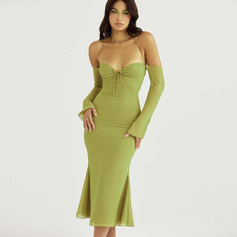 INS欧美夏季新品系带挂脖独立网纱长袖摆裙修身连衣裙2023年女款