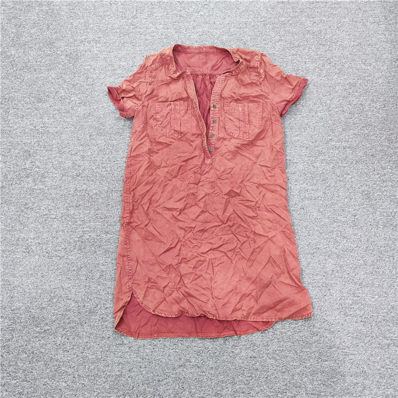 欧美复古 夏季女款做旧宽松短袖裙子 口袋V领半开衫重工连衣裙 夏