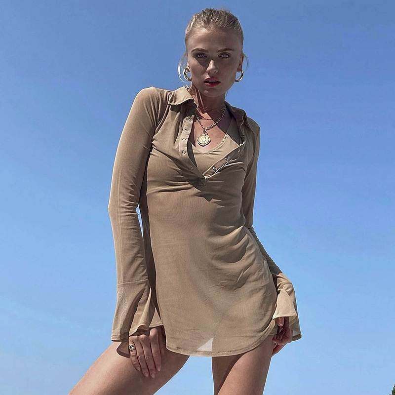 欧美风夏季新款纯色性感辣妹网纱POLO领喇叭袖短连衣裙女款2022年