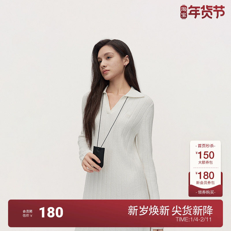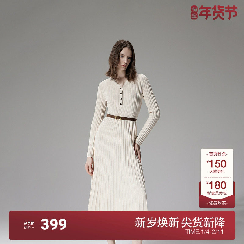 OCHIRLY欧时力羊毛长款毛织连衣裙V领软糯保暖显瘦2025春新款