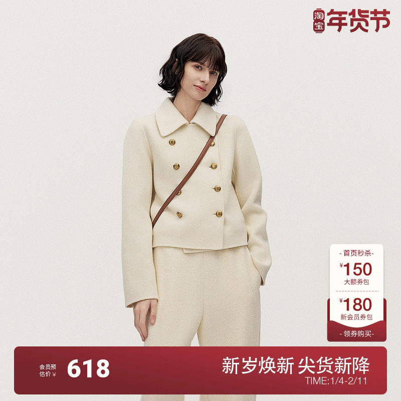 【季末折扣】欧时力羊毛双面呢排扣大衣外套驳领腰带复古2025秋冬