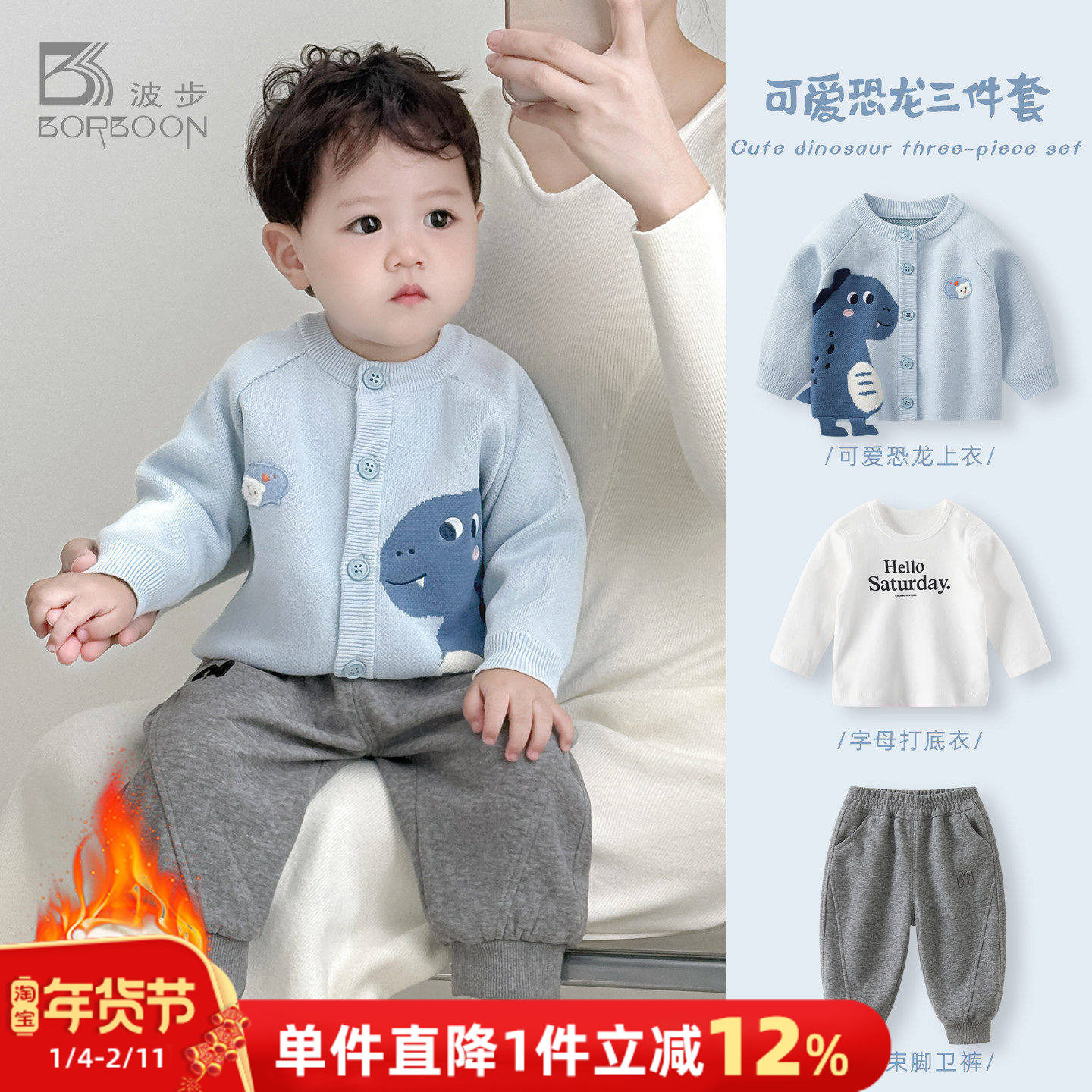 婴儿秋冬套装2026男宝宝毛衣开衫加绒洋气三件套男童冬装外套衣服