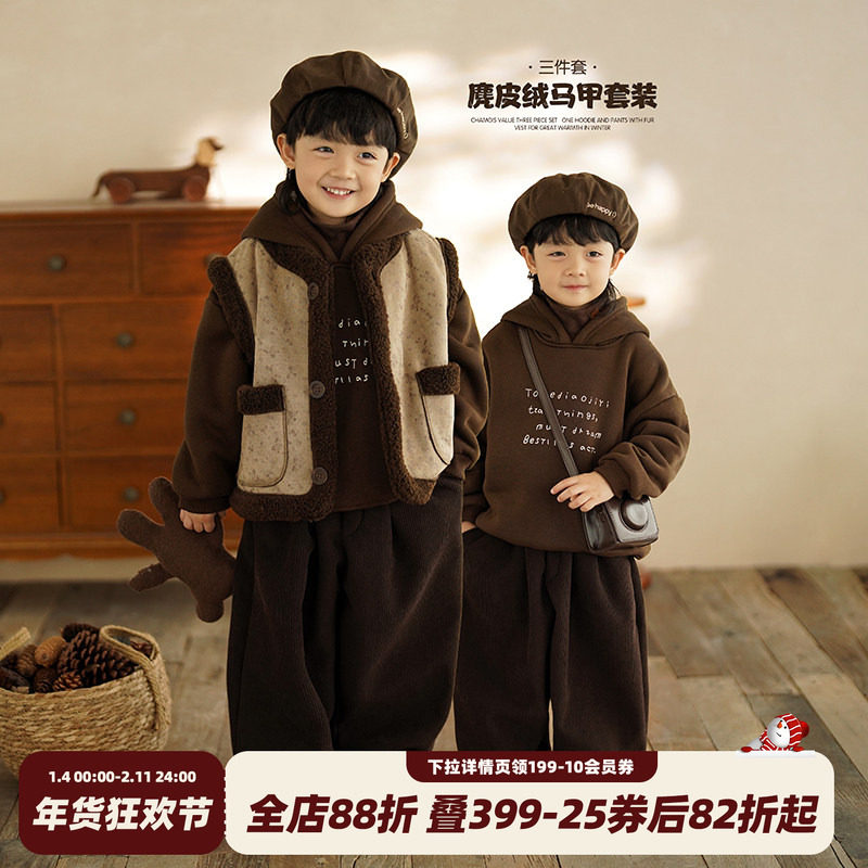 砚台家儿童加绒卫衣套装春秋款童装男童长袖衬衫马甲萝卜裤三件套