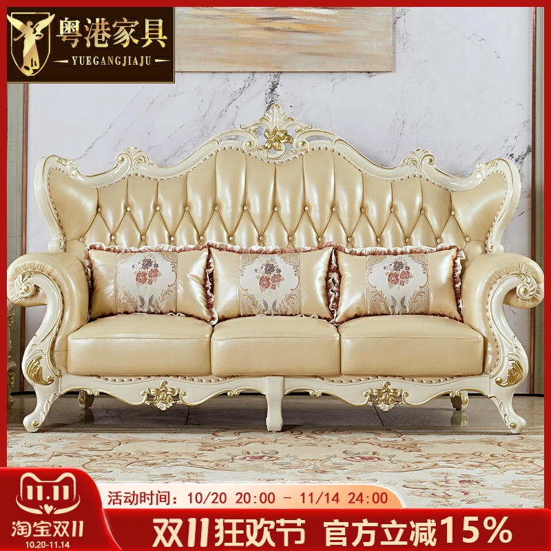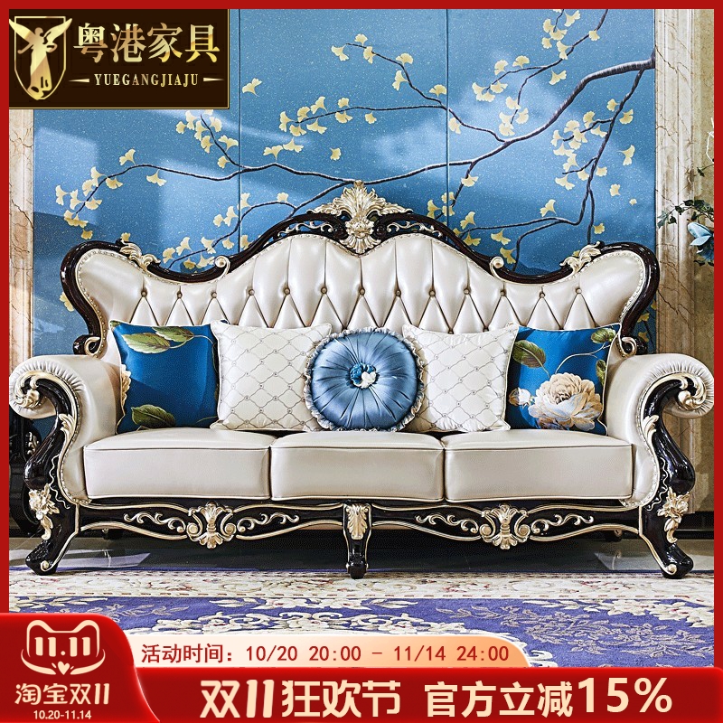 欧式真皮沙发美式别墅客厅实木雕花描金银1234组合皮艺沙发可定制