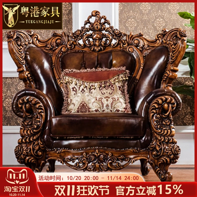 欧式真皮沙发 美式别墅客厅做旧实木单人沙发椅雕花休闲椅茶桌椅