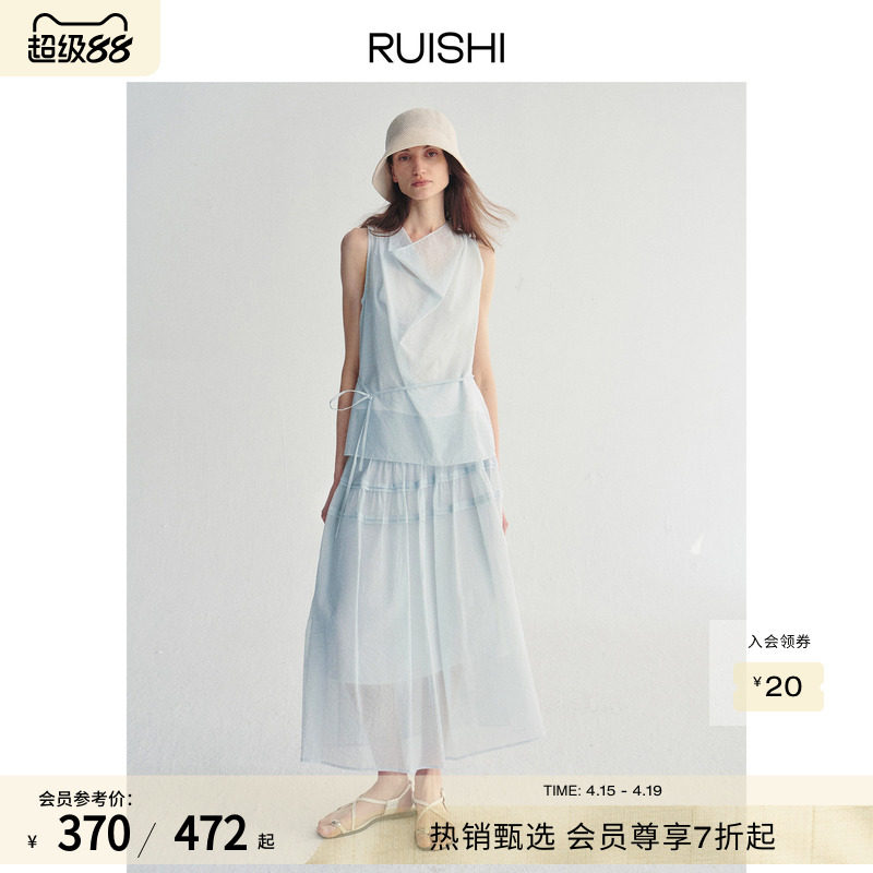 RUISHI芮时“蓝风信屿”棉锦混纺荡领垂感无袖上衣半身裙套装女夏