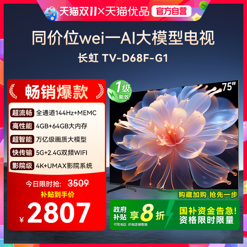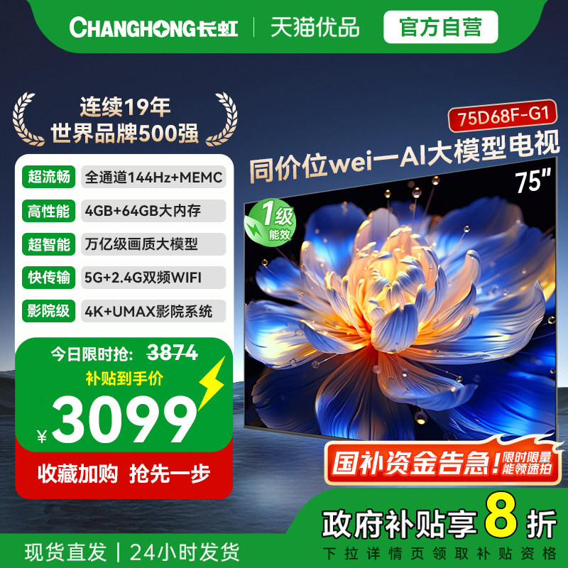 【政府补贴20%】长虹75D68F-G1 75英寸智能电视机4K超清客厅网络