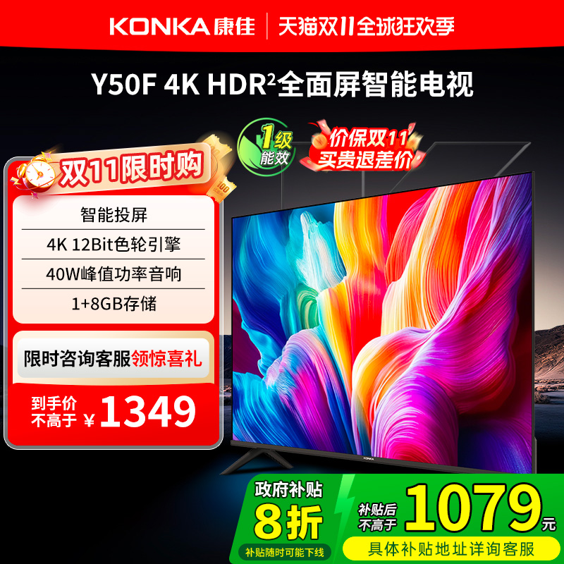康佳50英寸电视机4K全面屏护眼智能投屏家用液晶以旧换新补贴Y50F