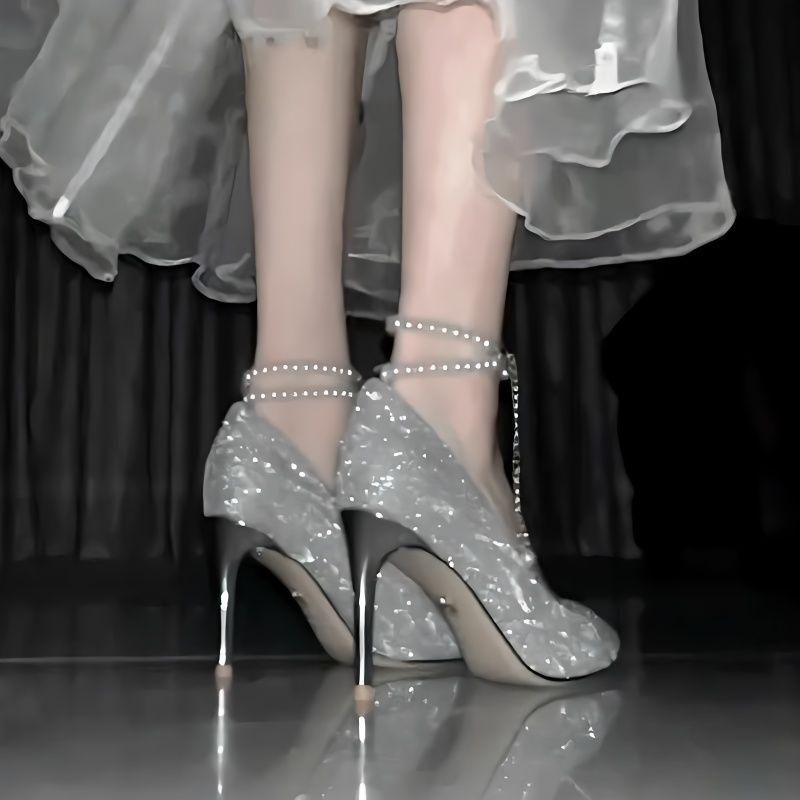银色高跟鞋女细跟2025新款一字带浅口单鞋珍珠绑带水晶鞋婚礼婚鞋