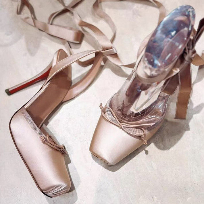 CL同款浅口蝴蝶结绑带红底单鞋2025新款尖头蕾丝网纱高跟鞋女细跟