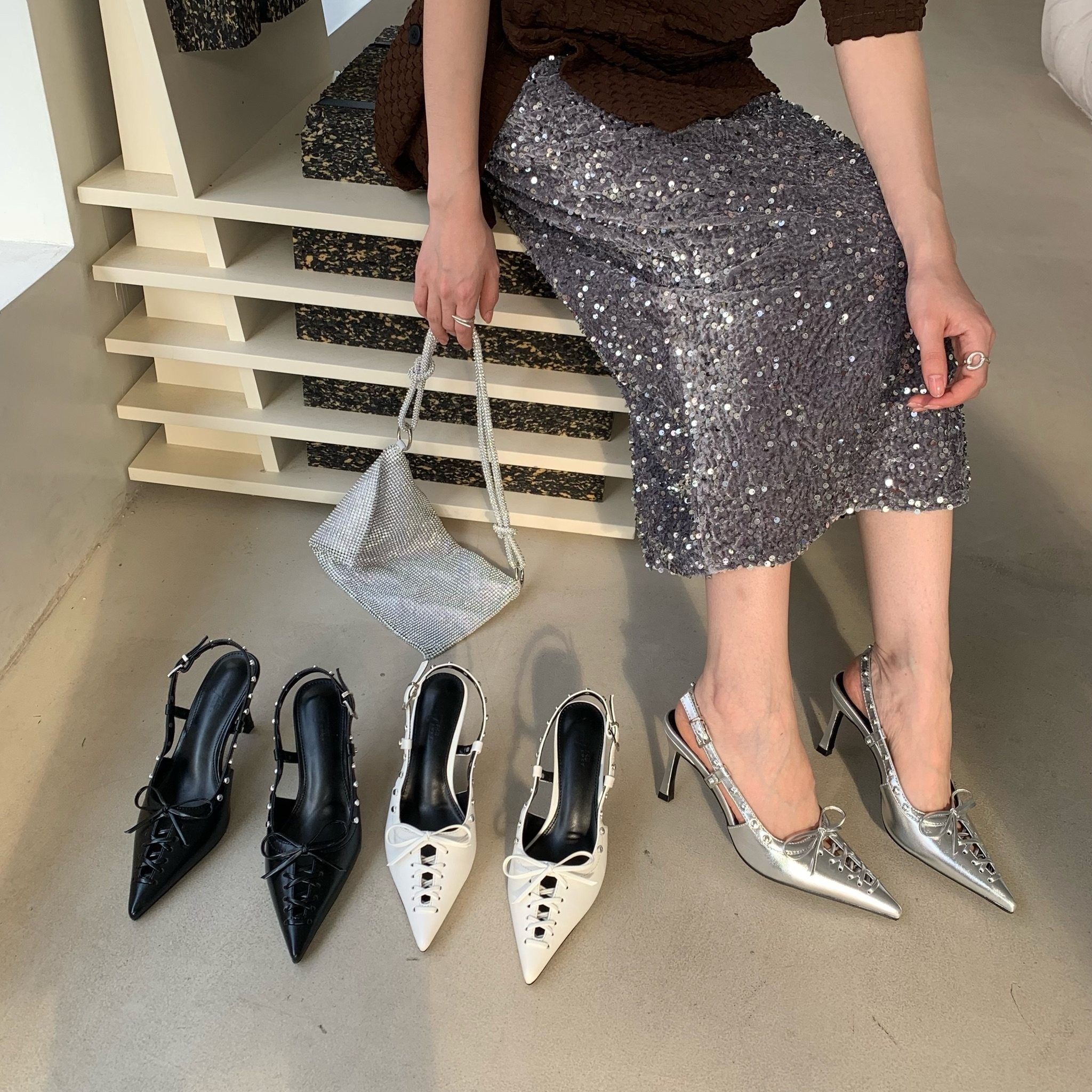 尖头绑带高跟鞋女2023年春夏细跟单鞋法式仙女风伴娘后空包头凉鞋
