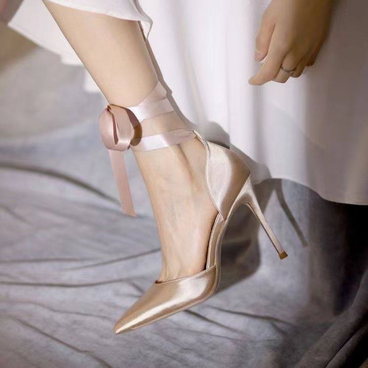 羊皮版dingyun丁允香槟高跟鞋千金风绑带单鞋法式细跟伴娘鞋气质