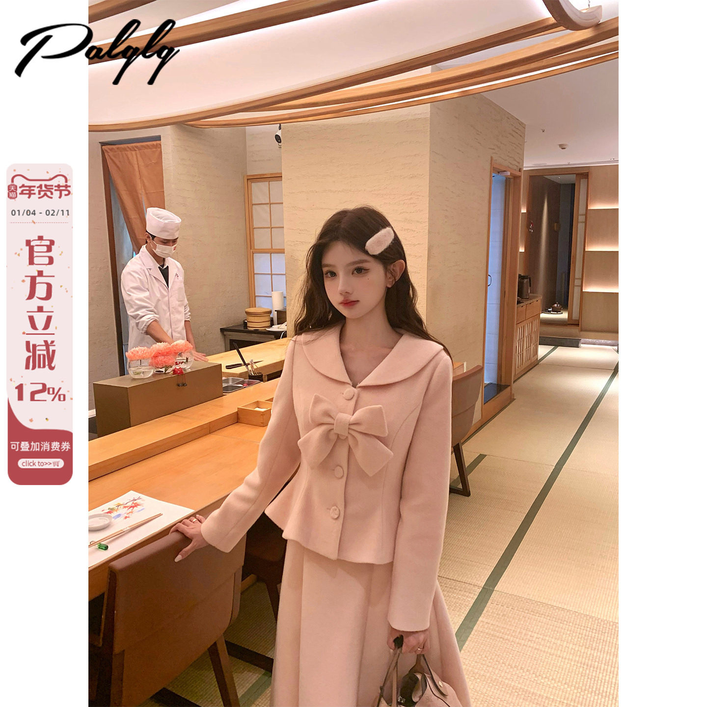 Palglg法式粉色毛呢外套吊带连衣裙两件套女冬气质富家千金风套装