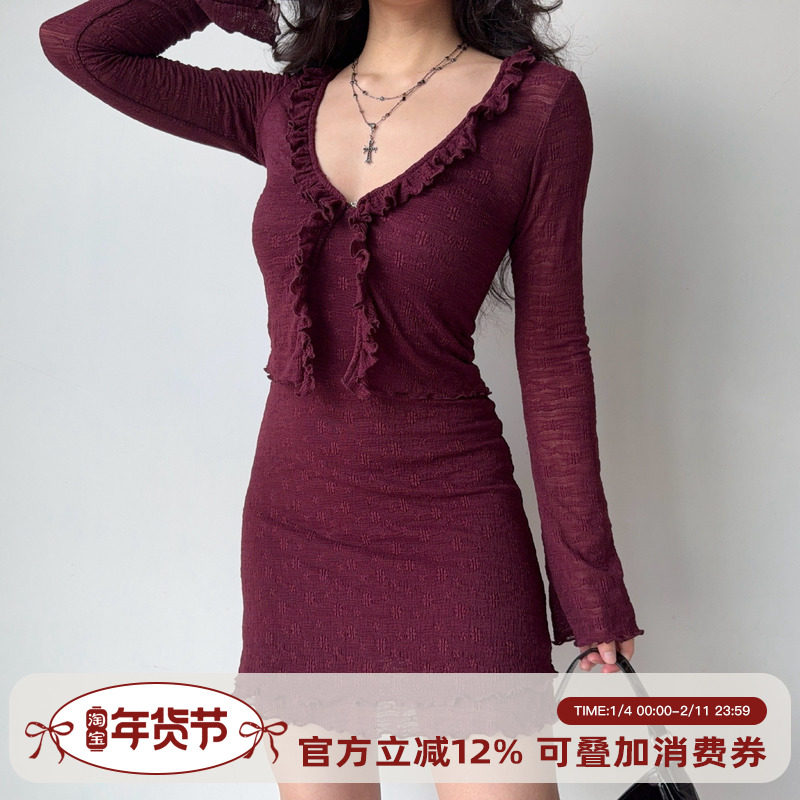 Go Girl Go 自制复古欧美风木耳边开衫吊带连衣裙两件套女秋季