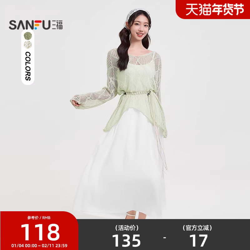 三福时尚套装女2025夏季镂空罩衫上衣吊带连衣裙两件套女装500265