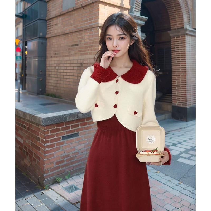 红色圣诞小香风外套吊带连衣裙两件套女秋冬季设计感法式裙子套装