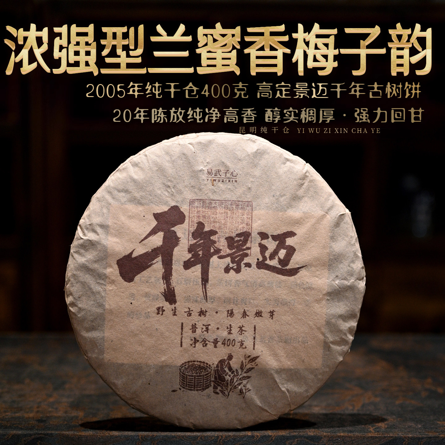 2005年景迈千年古树茶二十年陈化普洱生茶饼400克纯干仓高香老茶