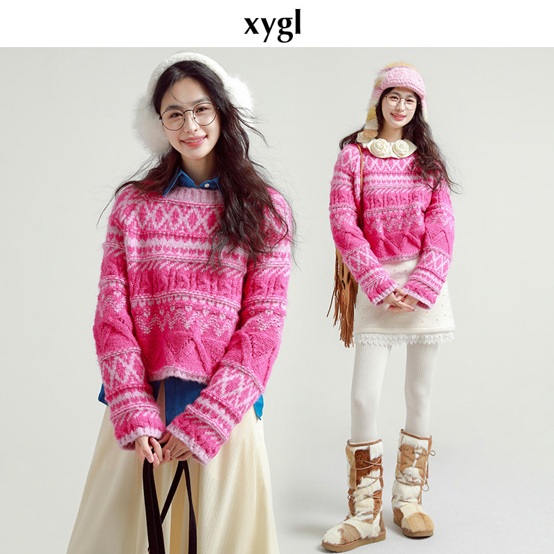 稀有概率暖莓物语立体羊毛提花粉色费尔岛冬季短款加厚套头毛衣女
