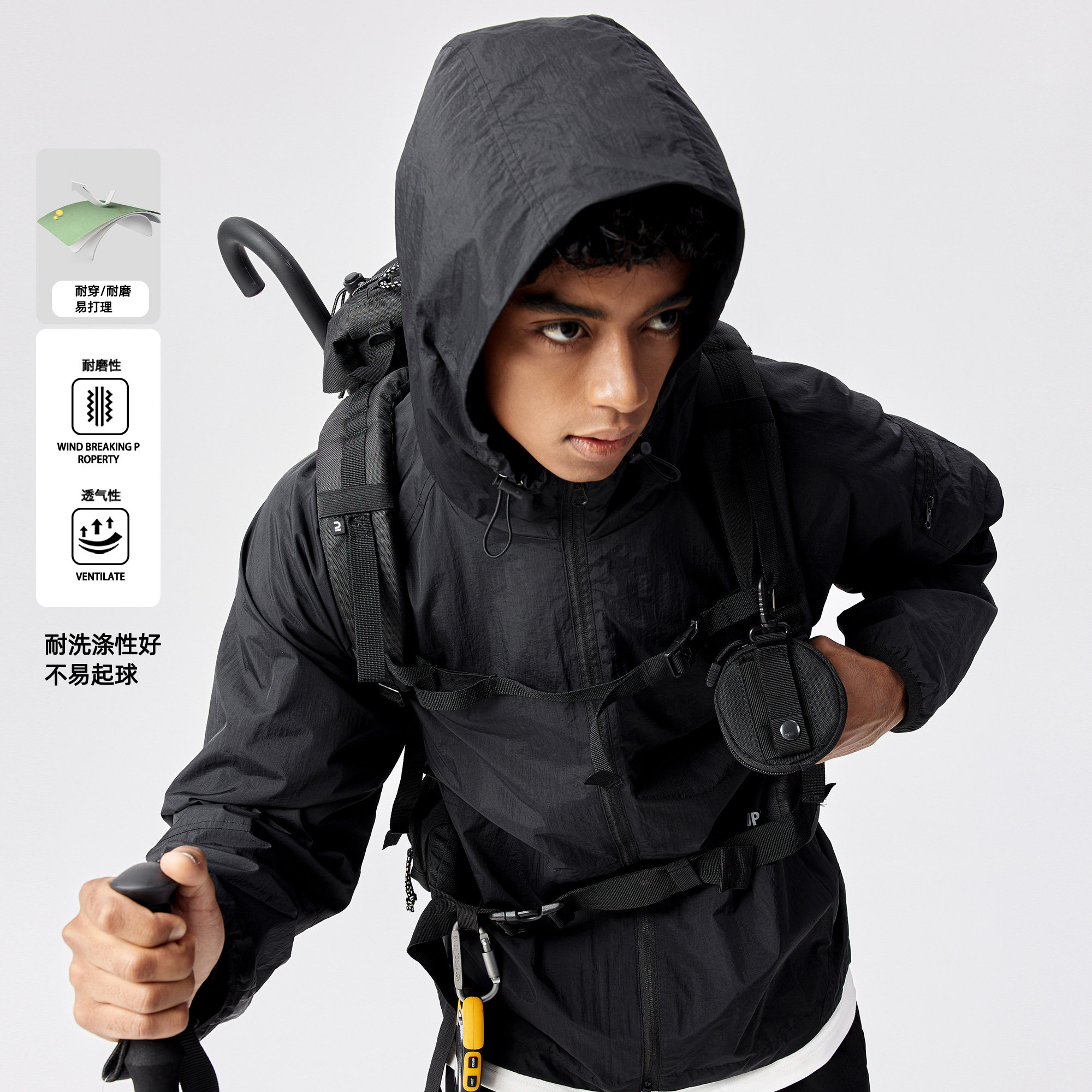 bdpowerup户外梭织连帽运动外套男简约拼接印花秋季外套男宽松