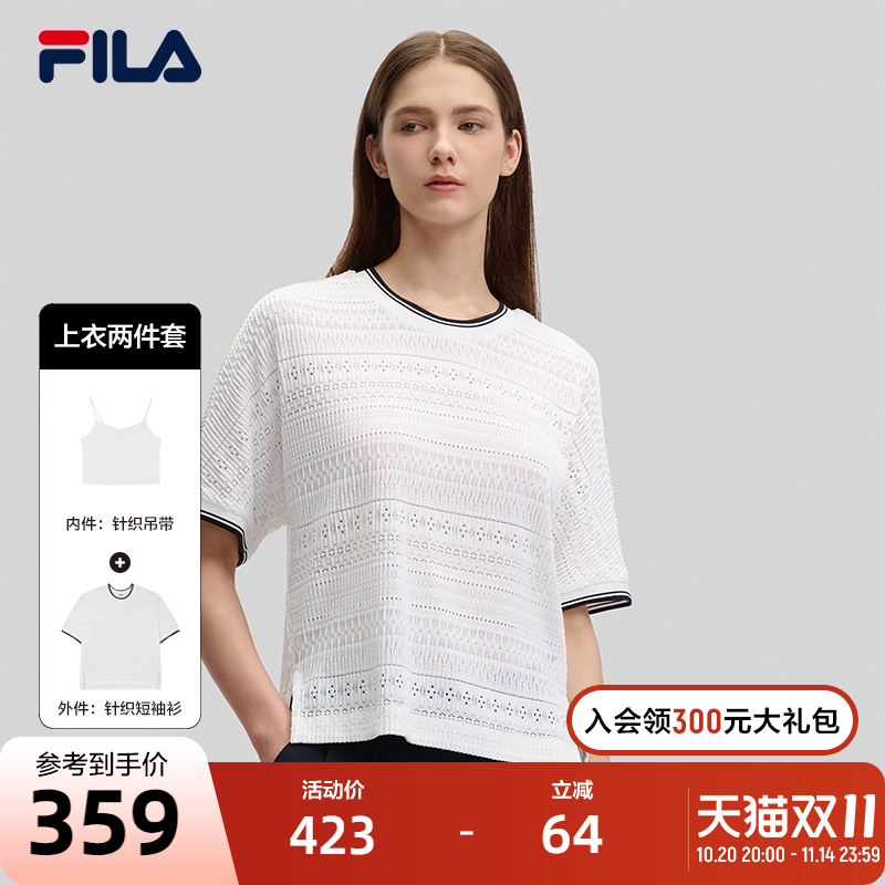 FILA Emerald斐乐女子针织衫两件套2024秋季新款时尚宽松短袖上衣