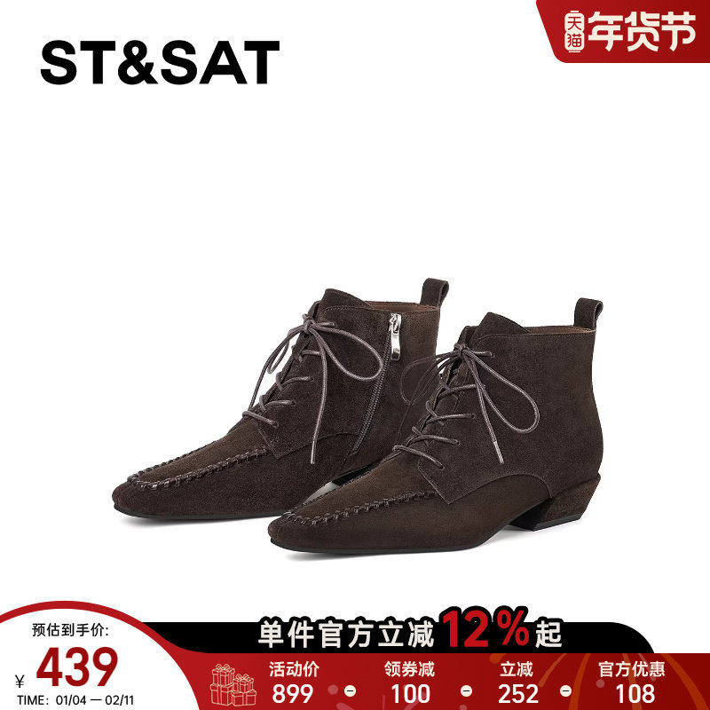 星期六美拉德马丁靴女2025秋冬方头真皮系带粗跟踝靴复古真皮短靴