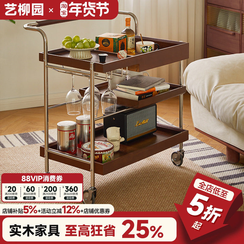 • 可移动边几小推车客厅沙发边柜中古茶几实木收纳置物架子酒水餐车