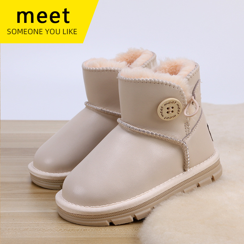 儿童雪地靴女真皮棉靴男童靴子加厚防水亮面皮毛一体宝宝软底短靴