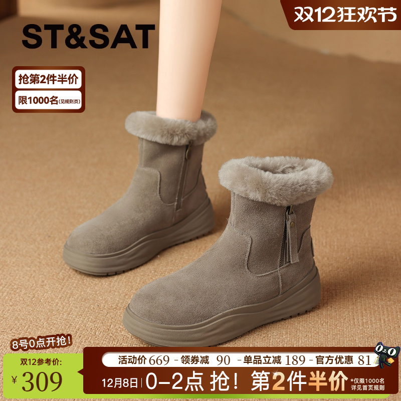 星期六真皮羊毛毛圈厚底雪地靴女2025新款冬季加绒保暖棉鞋棉靴子
