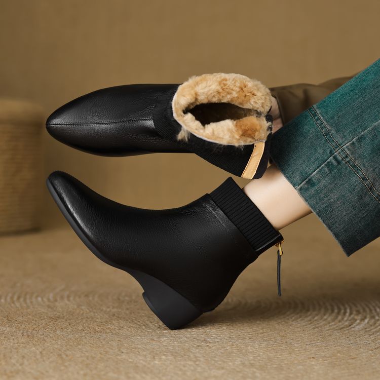 头层牛皮马丁靴女冬季新款英伦风短靴粗跟真皮羊毛棉靴软底妈妈鞋