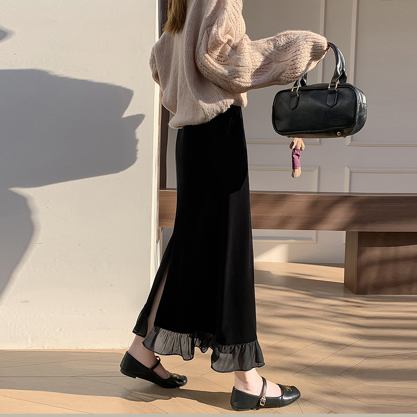 荷叶边丝绒半身裙女秋冬长裙高级感开叉a字包臀裙高腰直筒一步裙