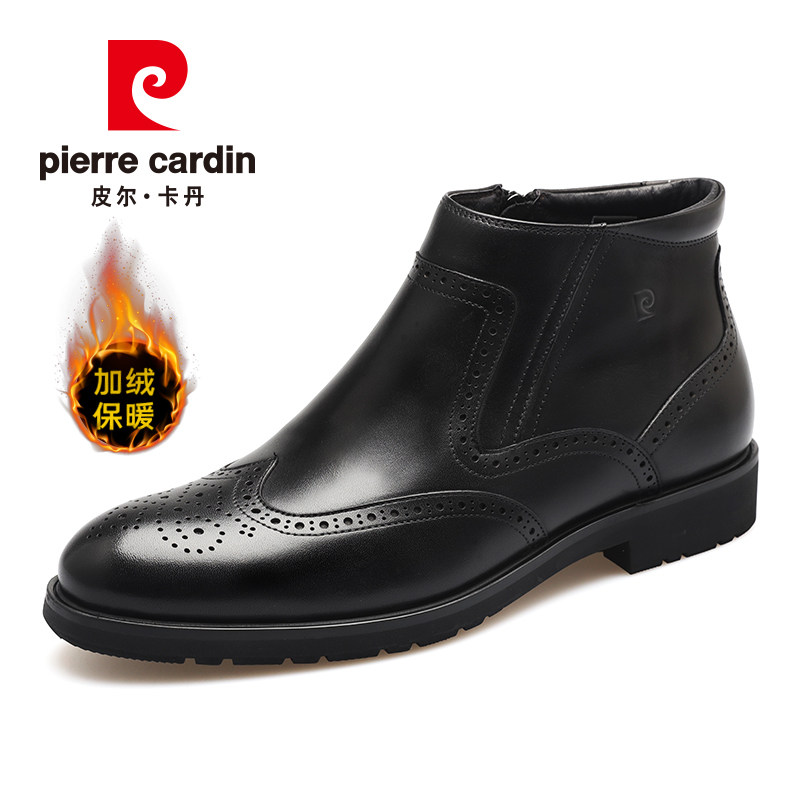 皮尔卡丹男靴冬季加绒保暖棉鞋高帮布洛克雕花靴子商务正装皮鞋男