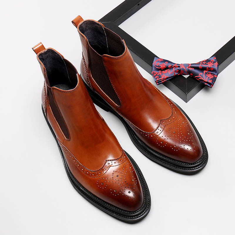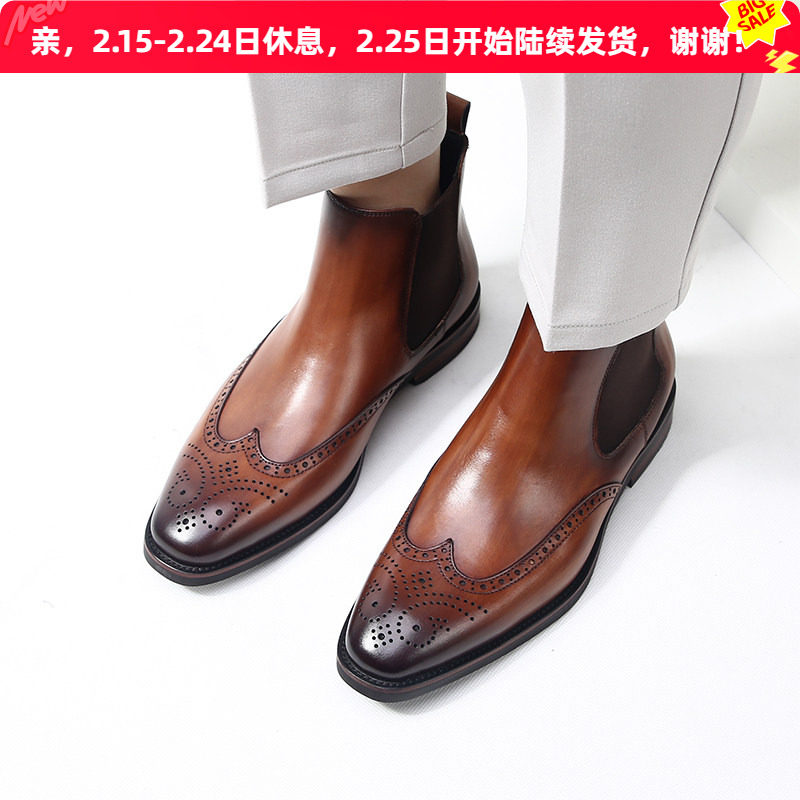欧美真皮男鞋切尔西靴中帮正装皮鞋英伦布洛克款式高帮雕花男靴潮