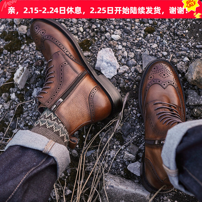 VQGT英伦布洛克雕花男靴高帮皮鞋真皮马丁靴男短靴男冬季牛津皮靴