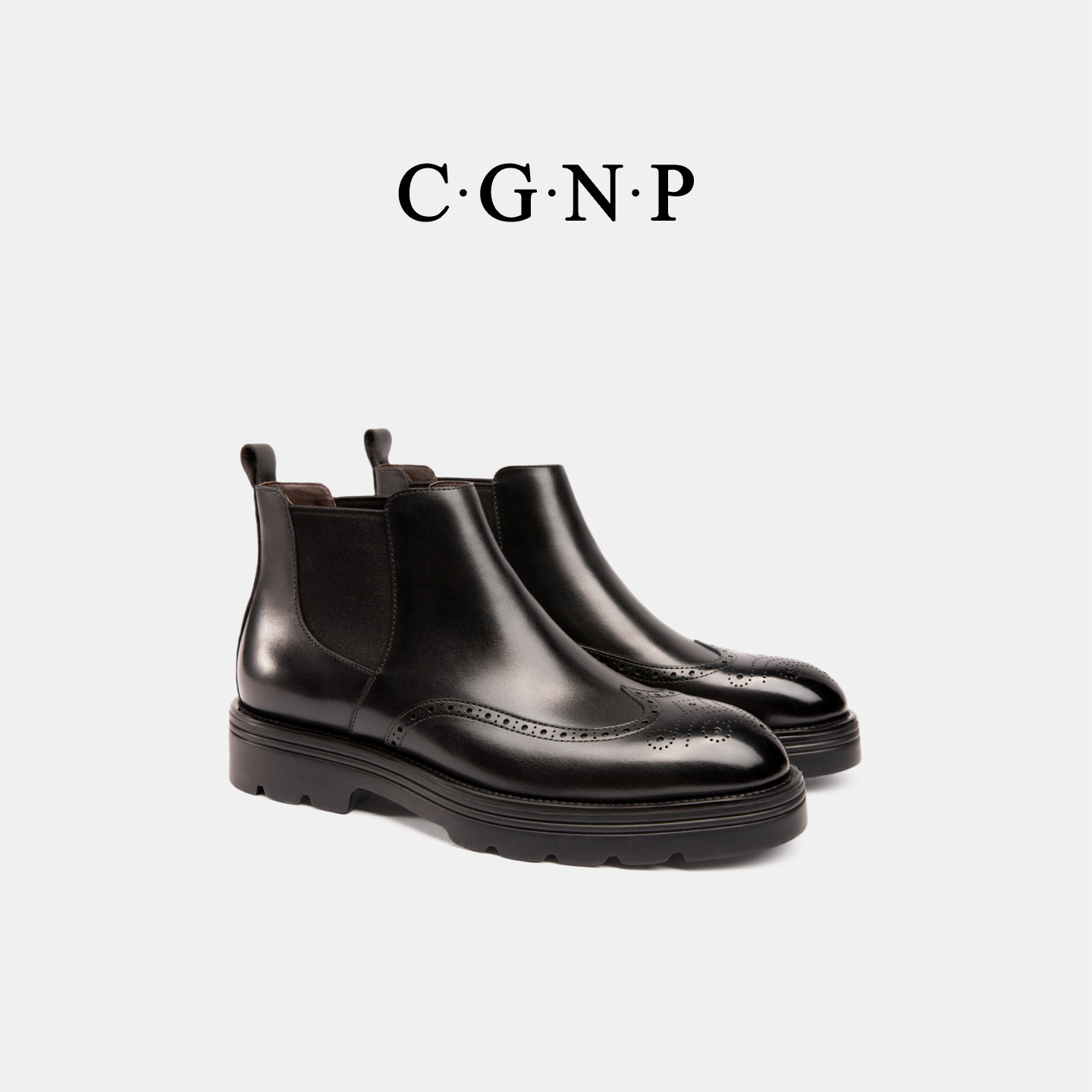 JINIWU吾倪季2025运动切尔西靴布洛克雕花厚底高帮增高擦蓝皮男靴