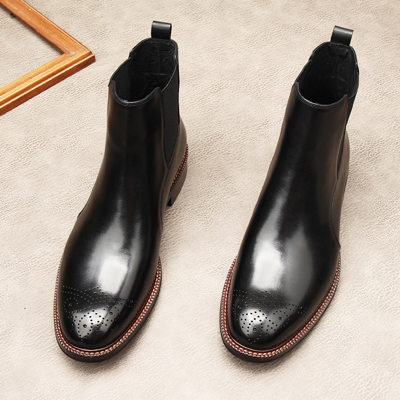 英伦商务真皮切尔西靴男士潮套筒尖头短靴雕花布洛克男靴高帮皮鞋