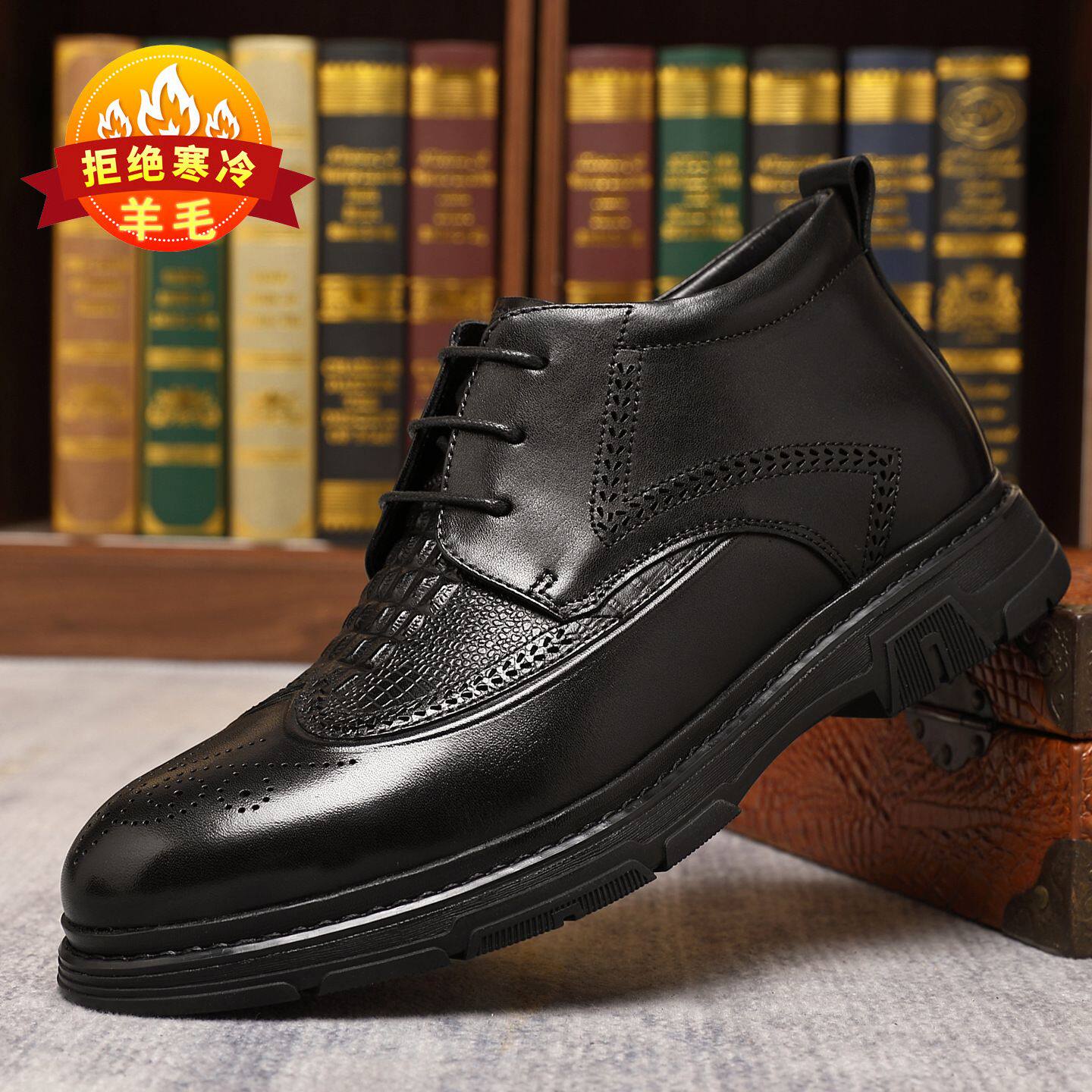 羊毛男靴2025冬新款真皮布洛克高帮系带低跟舒适保暖商务休闲皮鞋