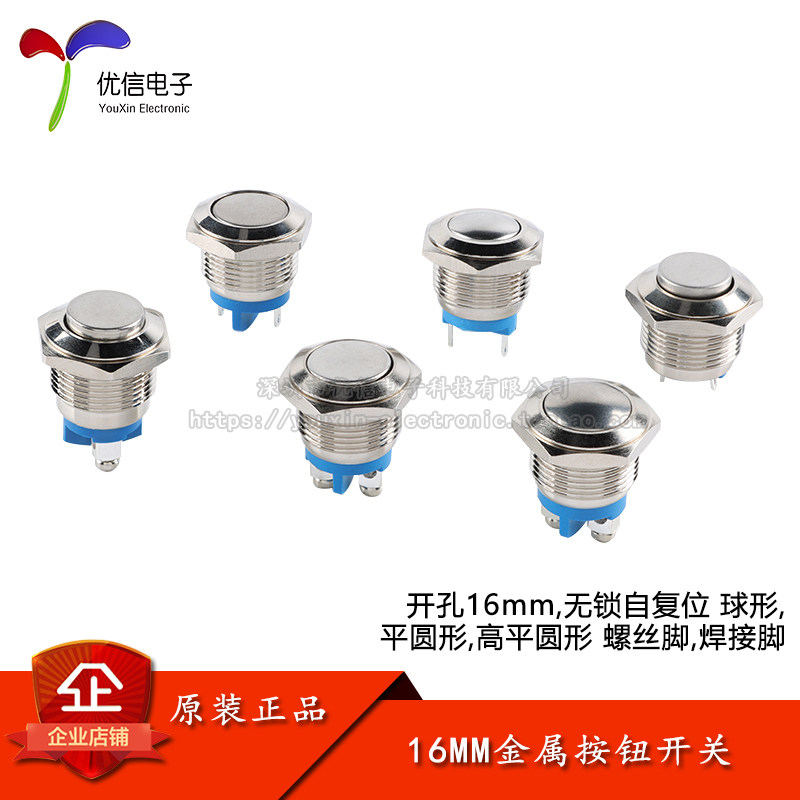 16MM金属按钮开关 16mm高平圆形球形无锁自复位开关2脚螺丝焊接脚