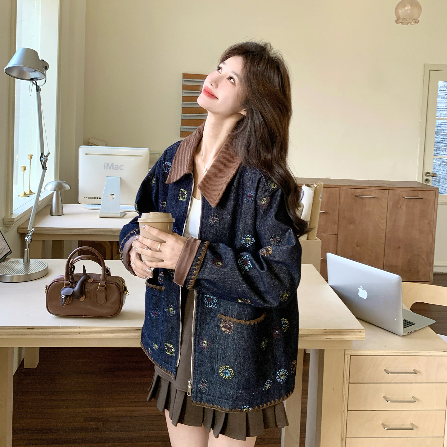 复古单宁翻领刺绣牛仔短外套可配一整套穿搭阔腿牛仔裤女套装V764