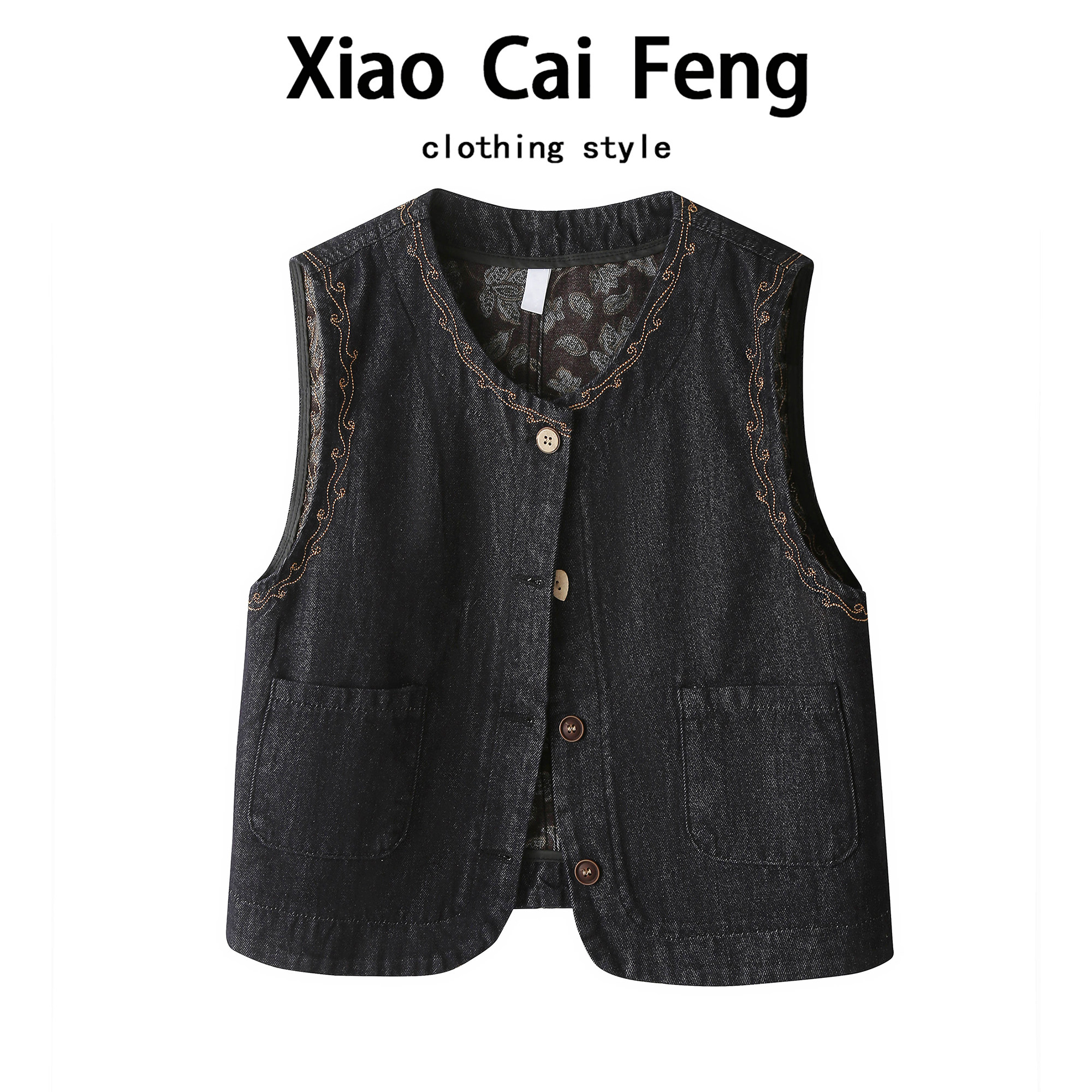 2026春秋新款复古刺绣牛仔马甲女短款宽松无袖坎肩背心外套外搭潮